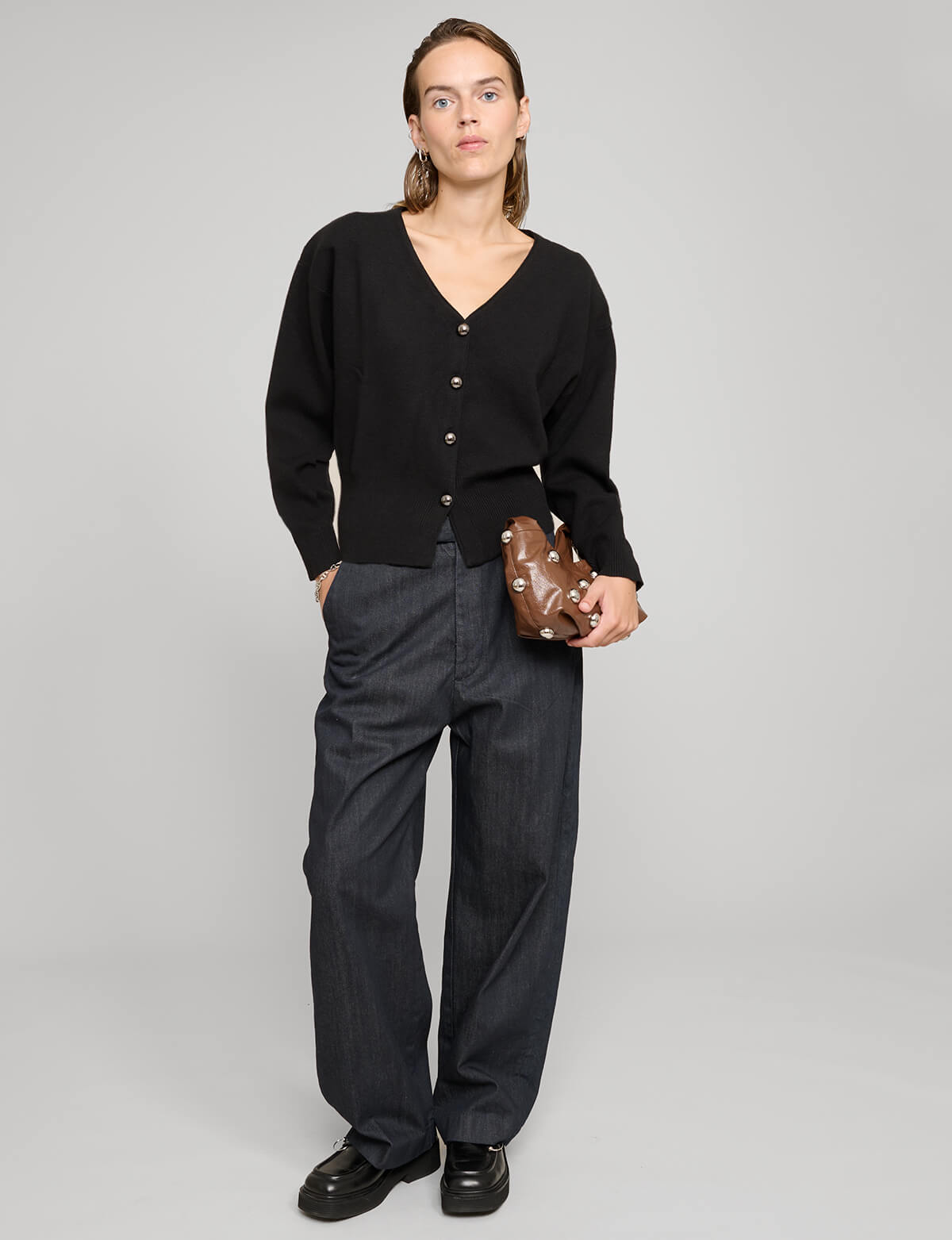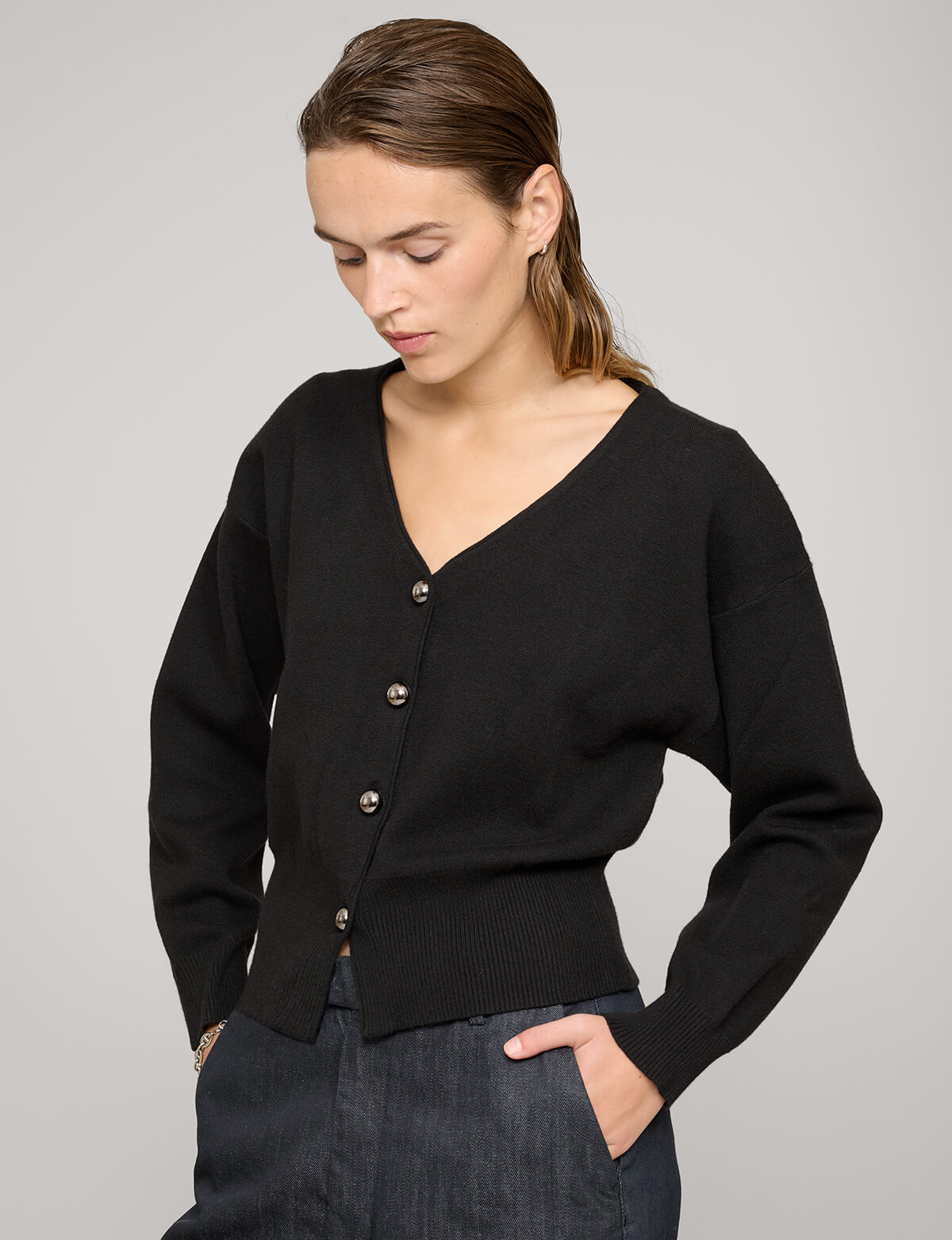 Black knit shoulder padded knit cardigan with large deco matte silver buttons .